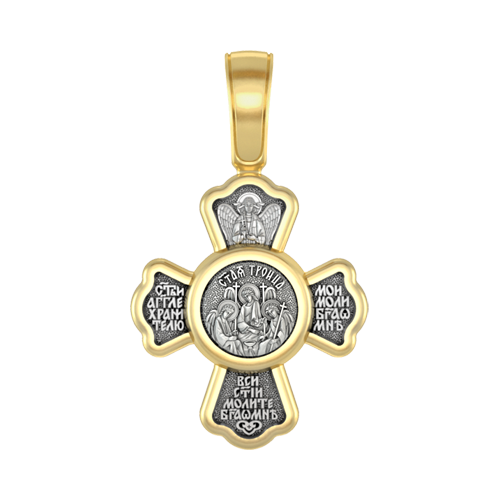 Крест с распятием Христовым на лицевой стороне и образом самого могучего Ангела воинства Христова Архистратига Михаила на оборотной. На крестике написана молитва: «Все святые молите Бога о мне». Крест с распятием Христовым на...