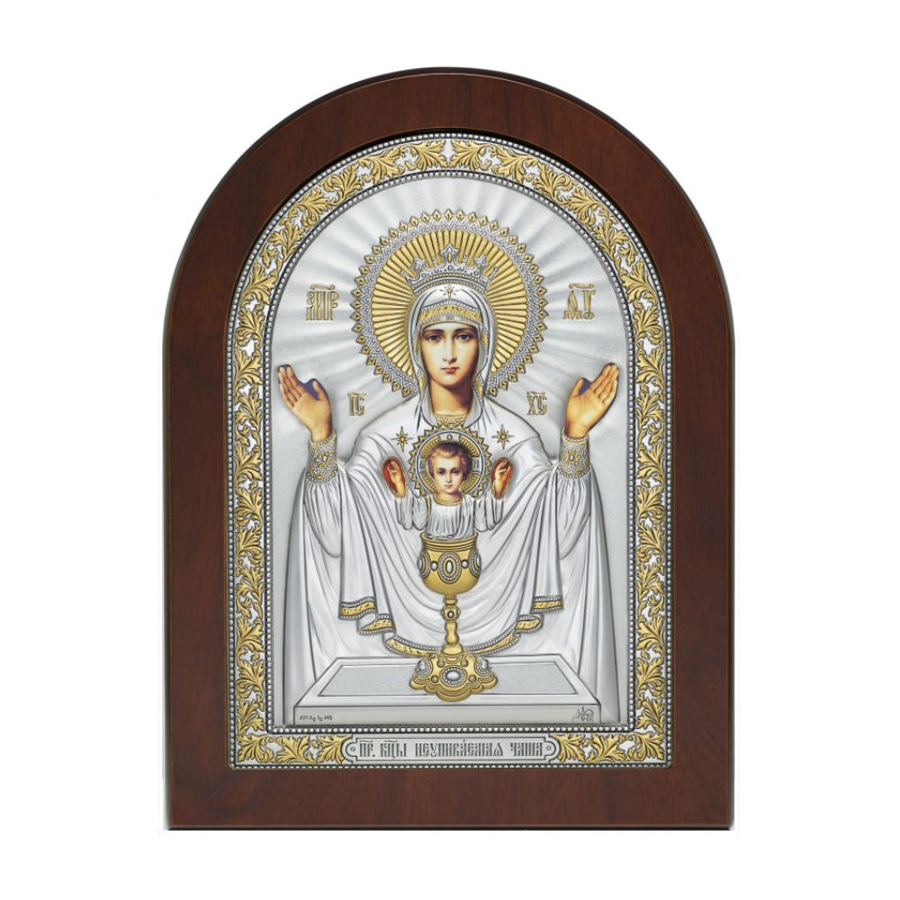 Оклад иконы с образом Богородицы Неупиваемая Чаша изготовлен из листового серебра 999° толщиной 0,03 (мм) и листа алюминия, который необходим для придания прочности. Оклад декорирован золотым лаком. Изображение выполнено методом полноразмерной шелкографии. Икона упакована в подарочную упаковку с вкладышем-описанием.