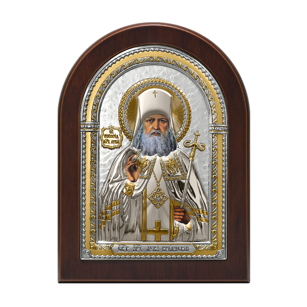 Оклад иконы с образом Святителя Луки Крымского изготовлен из листового серебра 999° толщиной 0,03 (мм) и листа алюминия, который необходим для придания прочности. Оклад декорирован золотым лаком. Изображение выполнено методом полноразмерной шелкографии. Икона упакована в подарочную упаковку с вкладышем-описанием.
