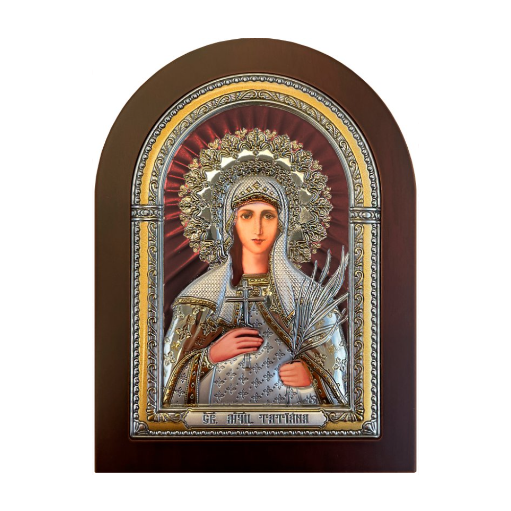 Икона Святой Мученицы Татьяны Римской в серебряном окладе. Оклад изготовлен из биметалла. Это лист серебра толщиной 0,02-0,03 (мм) и лист алюминия, который необходим для придания прочности. Оклад покрыт защитным покрытием, золотым и коричневым лаком.