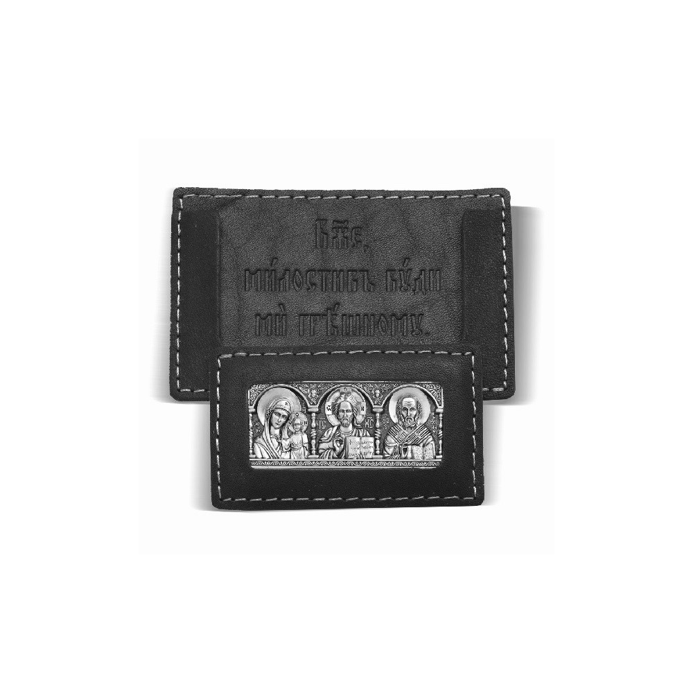 Автомобильная икона представляет собой триптих: икона Спасителя, Богородицы и Святой Матроны Московской (или Святого Николая Чудотворца). Автоикона в футляре, крепится на панель двусторонним скотчем.