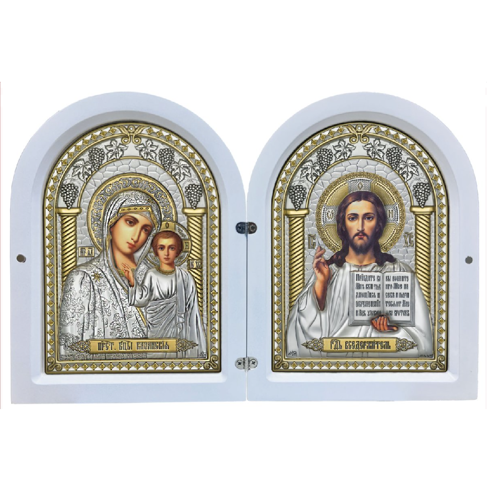 Оклад иконы с образом Богородицы и Христа Спасителя изготовлен из листового серебра 999° толщиной 0,03 (мм) и листа алюминия, который необходим для придания прочности. Оклад декорирован золотым лаком. Изображение выполнено методом шелкографии. Складень упакован в подарочную упаковку с вкладышем-описанием.