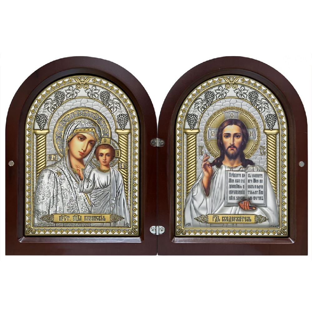 Оклад иконы с образом Господа и Пресвятой Богородицы изготовлен из листового серебра 999° толщиной 0,03 (мм) и листа алюминия, который необходим для придания прочности. Оклад декорирован золотым лаком. Изображение выполнено методом шелкографии. Складень упакован в подарочную упаковку с вкладышем-описанием.