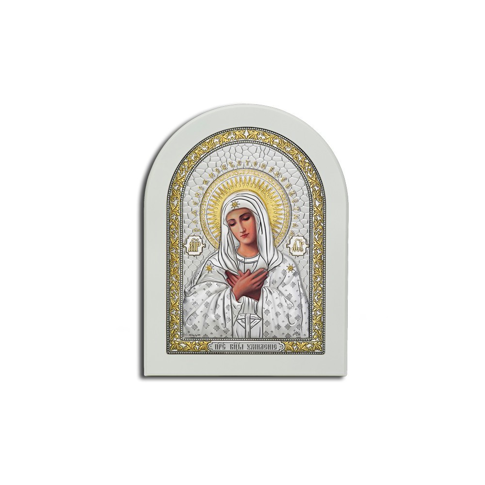 Оклад иконы с образом Божией Матери «Умиление» изготовлен из листового серебра 999° толщиной 0,03 (мм) и листа алюминия, который необходим для придания прочности. Оклад декорирован золотым лаком. Изображение выполнено методом полноразмерной шелкографии. Икона упакована в подарочную упаковку с вкладышем-описанием.