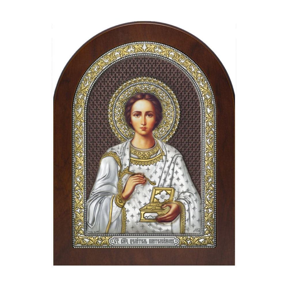 Оклад иконы с образом Святого Целителя Пантелеимона изготовлен из листового серебра 999° толщиной 0,03 (мм) и листа алюминия, который необходим для придания прочности. Оклад декорирован золотым лаком и коричневой эмалью. Изображение выполнено методом шелкографии. Икона упакована в подарочную упаковку с вкладышем-описанием.