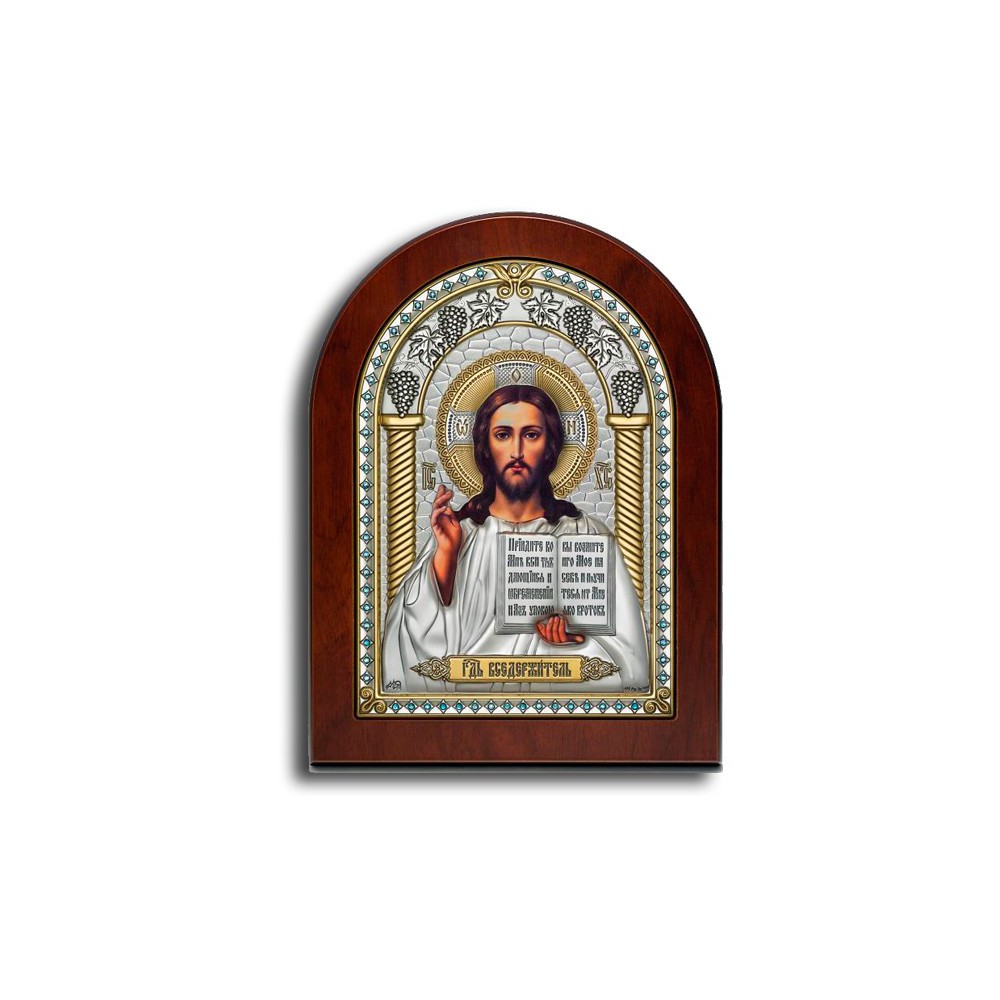 Оклад иконы с образом Господа Иисуса Христа изготовлен из листового серебра 999° толщиной 0,03 (мм) и листа алюминия, который необходим для придания прочности. Оклад декорирован золотым лаком и стразами. Изображение выполнено методом шелкографии. Упакована икона в подарочную упаковку с вкладышем-описанием.