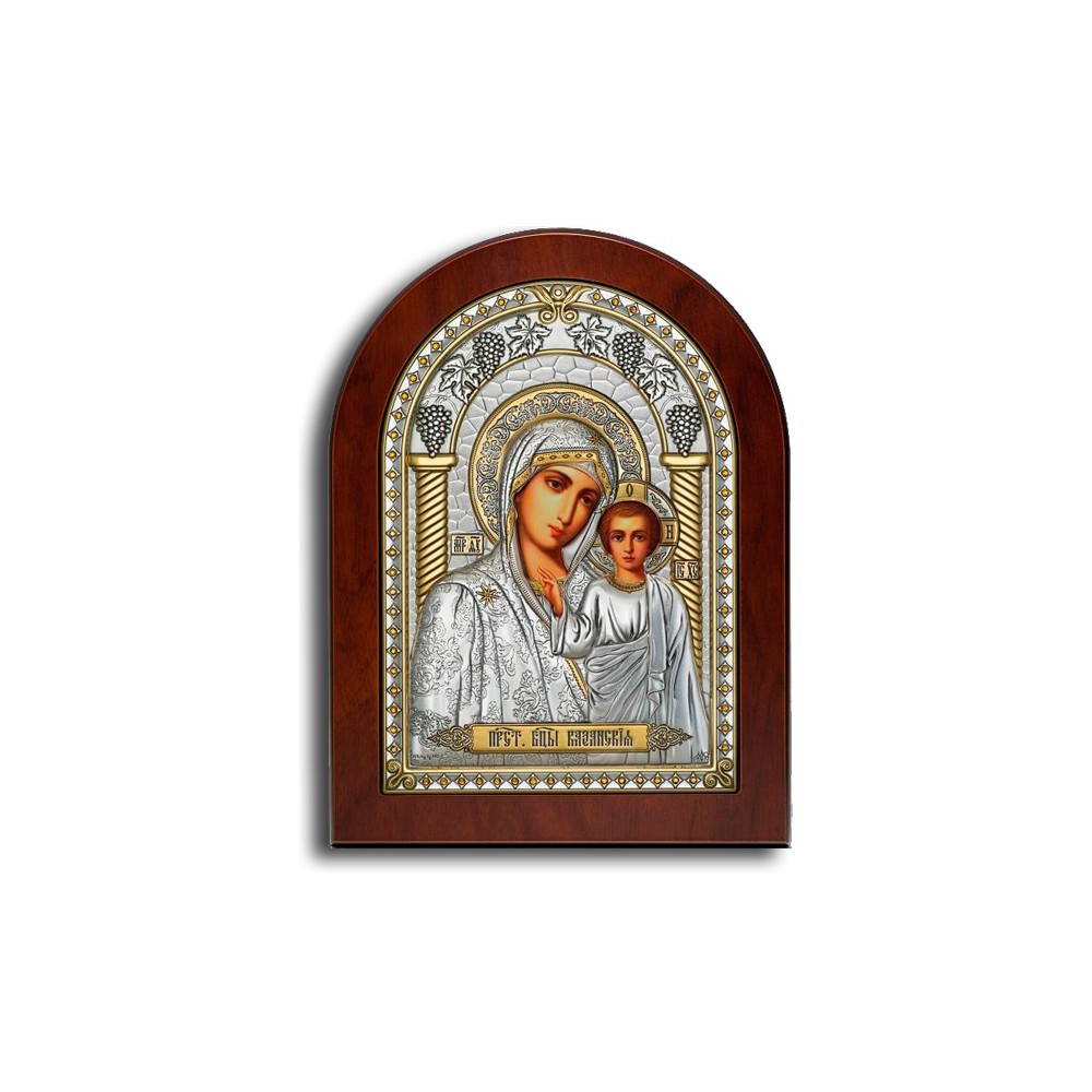 Оклад с образом Казанской Божьей Матери изготовлен из листового серебра 999° толщиной 0,03 (мм) и листа алюминия, который необходим для придания прочности. Оклад иконы декорирован стразами и золотым лаком. Изображение выполнено методом полноразмерной шелкографии. Икона упакована в подарочную упаковку с вкладышем-описанием.