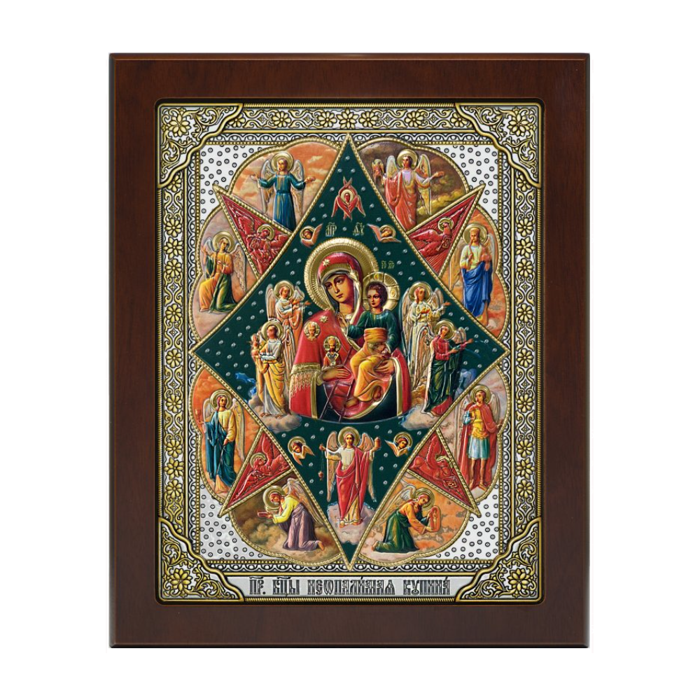 Оклад иконы Богородицы Неопалимая Купина изготовлен из листового серебра 999° толщиной 0,03 (мм) и листа алюминия, который необходим для придания прочности. Оклад украшен золотым лаком и керамической эмалью. Изображение выполнено методом полноразмерной шелкографии. Икона упакована в подарочную упаковку с вкладышем-описанием.