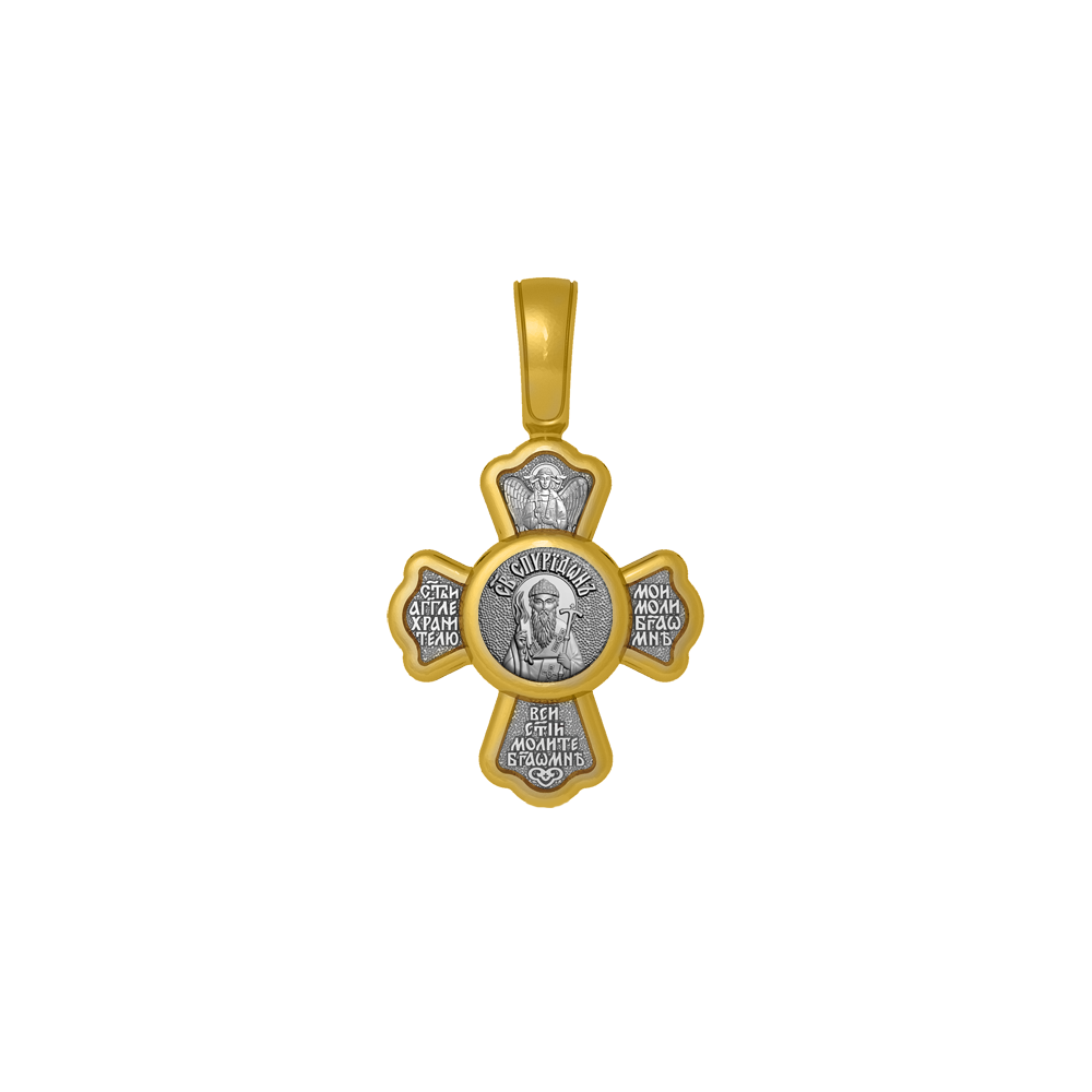 Крест с распятием Христовым на лицевой стороне и образом Святителя Спиридона на оборотной. На крестике написана молитва: «Святый Ангел Хранитель мой моли Бога о мне», «Все святые молите Бога о мне».