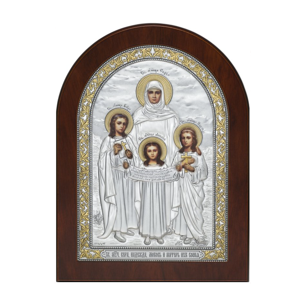 Оклад иконы с образом Вера, Надежда, Любовь и мать их София изготовлен из листового серебра 999° толщиной 0,03 (мм) и листа алюминия, который необходим для придания прочности. Оклад декорирован золотым лаком. Изображение выполнено методом шелкографии. Икона упакована в красивую подарочную упаковку с вкладышем-описанием.