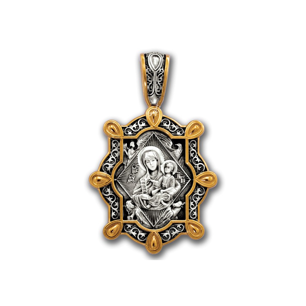 На лицевой стороне нательной иконки изображен образ Богородицы «Неопалимая Купина». На обороте написаны слова прославления «Чертог и Дверь, и Престол Огненный нарицаем Тебе, Богородице, и Несекомую Гору и Купину Непалимую».