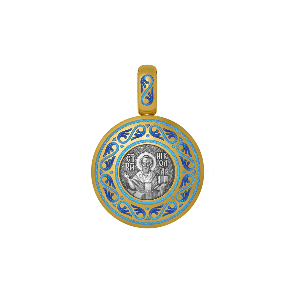 Нательная икона с образом Николая Чудотворца на лицевой стороне и Ангелом Хранителем на оборотной. Образок фрагментарно декорирован цветной горячей ювелирной эмалью, чернением и позолотой.