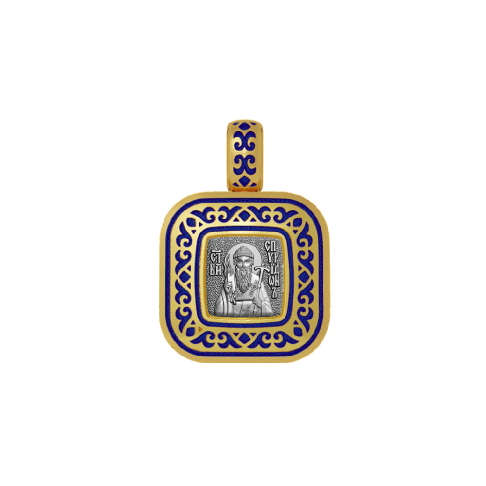 Иконка с образом Святителя Спиридона Тримифунтского на лицевой стороне и Ангелом на оборотной. Подвеска фрагментарно декорирована цветной горячей ювелирной эмалью, чернением и позолотой.