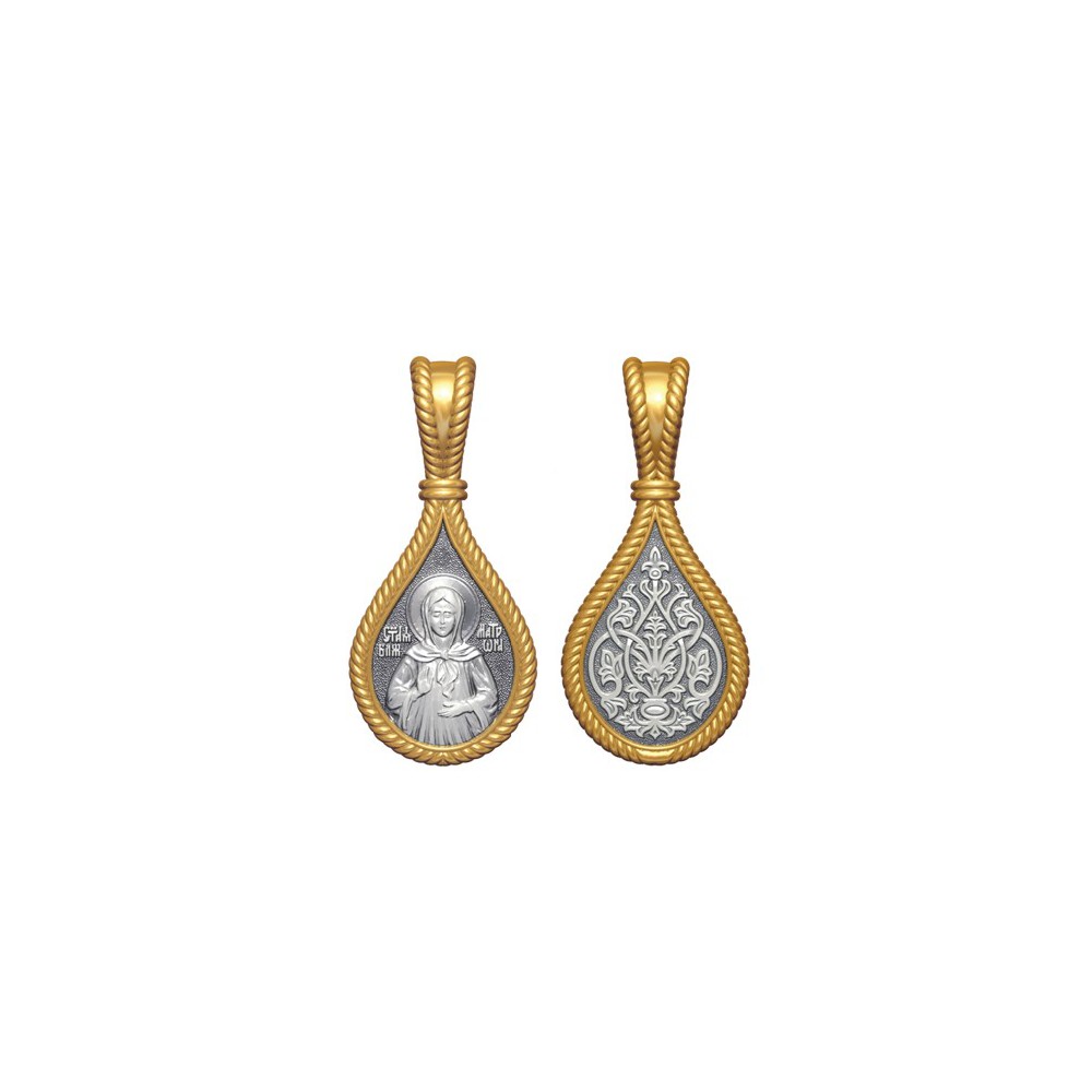 Позолоченная нательная иконка с почитаемым образом Святой Матроны Московской на лицевой стороне и Ангела Хранителя на оборотной.