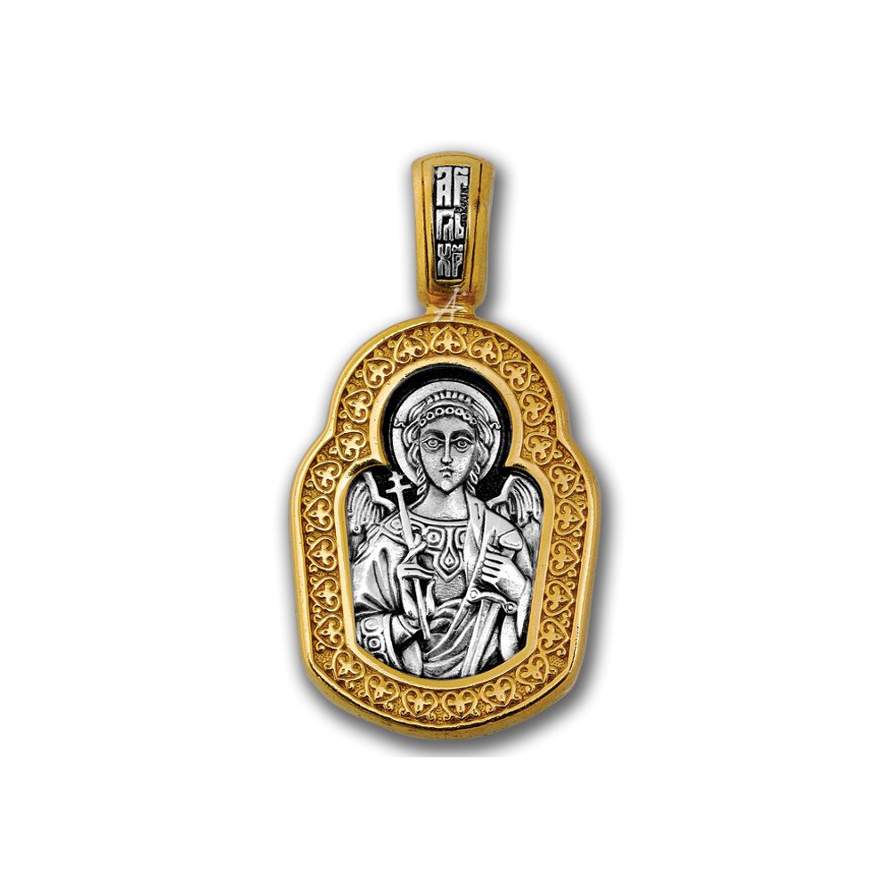На лицевой стороне образка в окружении орнамента, символизирующего процветшие любовью к Господу сердца, изображен Ангел Хранитель. В правой руке у него крест — знак послушания Христу и следования Его заповедям. В левой руке Ангел сжимает меч: им он отражает нападения бесов, пытающихся уловить человеческую душу.