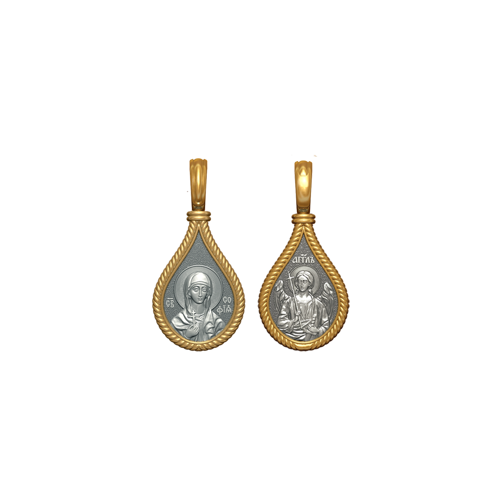 Позолоченная нательная иконка с почитаемым образом Святой мученицы Софии на лицевой стороне и Ангела Хранителя на оборотной.