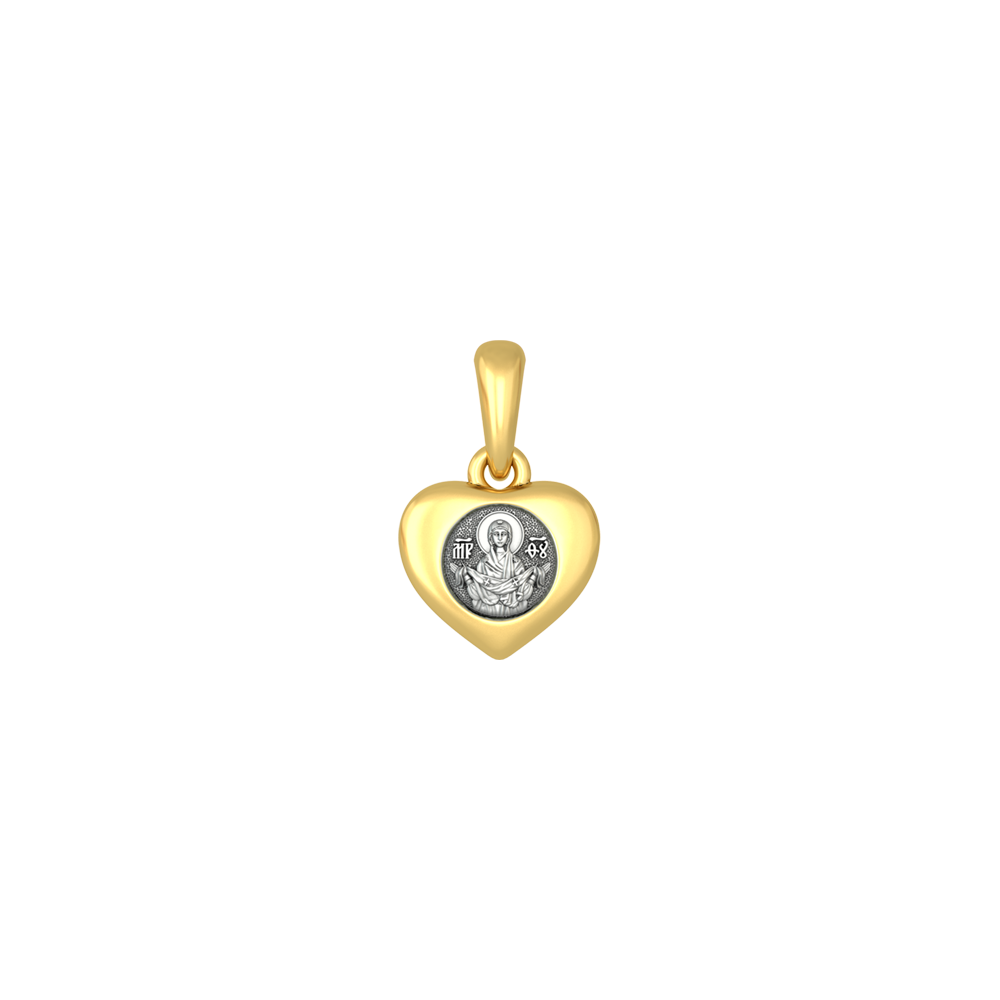 Серебряная иконка на подвижной петельке в форме сердца с образом Покров Пресвятой Богородицы на лицевой стороне и райскими птицами на оборотной. Птицы райского сада сидящие на ветках — это Евангельский символ людей, о которых Бог неустанно заботится, как о Своих детях.