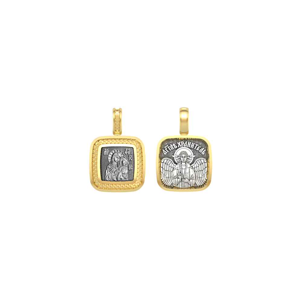 Миниатюрная нательная иконка с образом Божией Матери «Неувядаемый цвет» на лицевой стороне и Ангела Хранителя на оборотной.