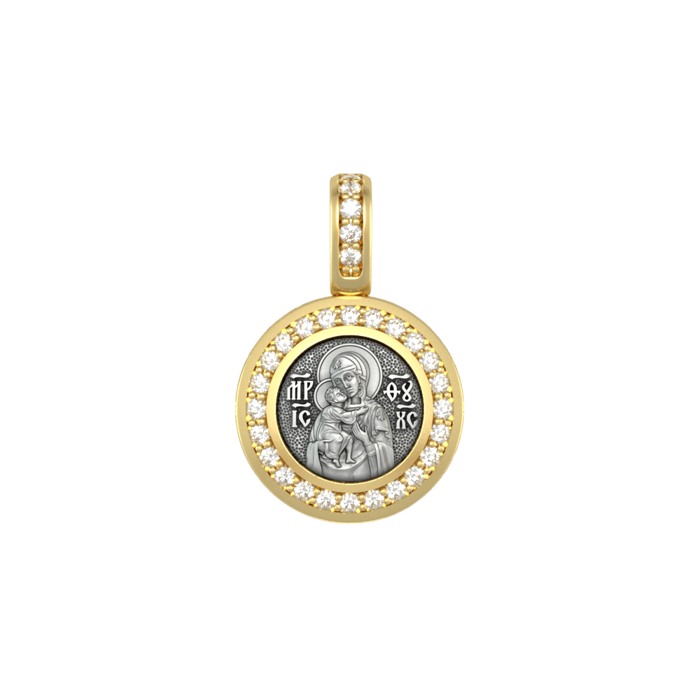Православная иконка с изображением Феодоровской Богородицы на лицевой стороне и Ангелом Хранителем на оборотной. Лицевая сторона украшена 29 фианитами которые придают подвеске яркое сияние.