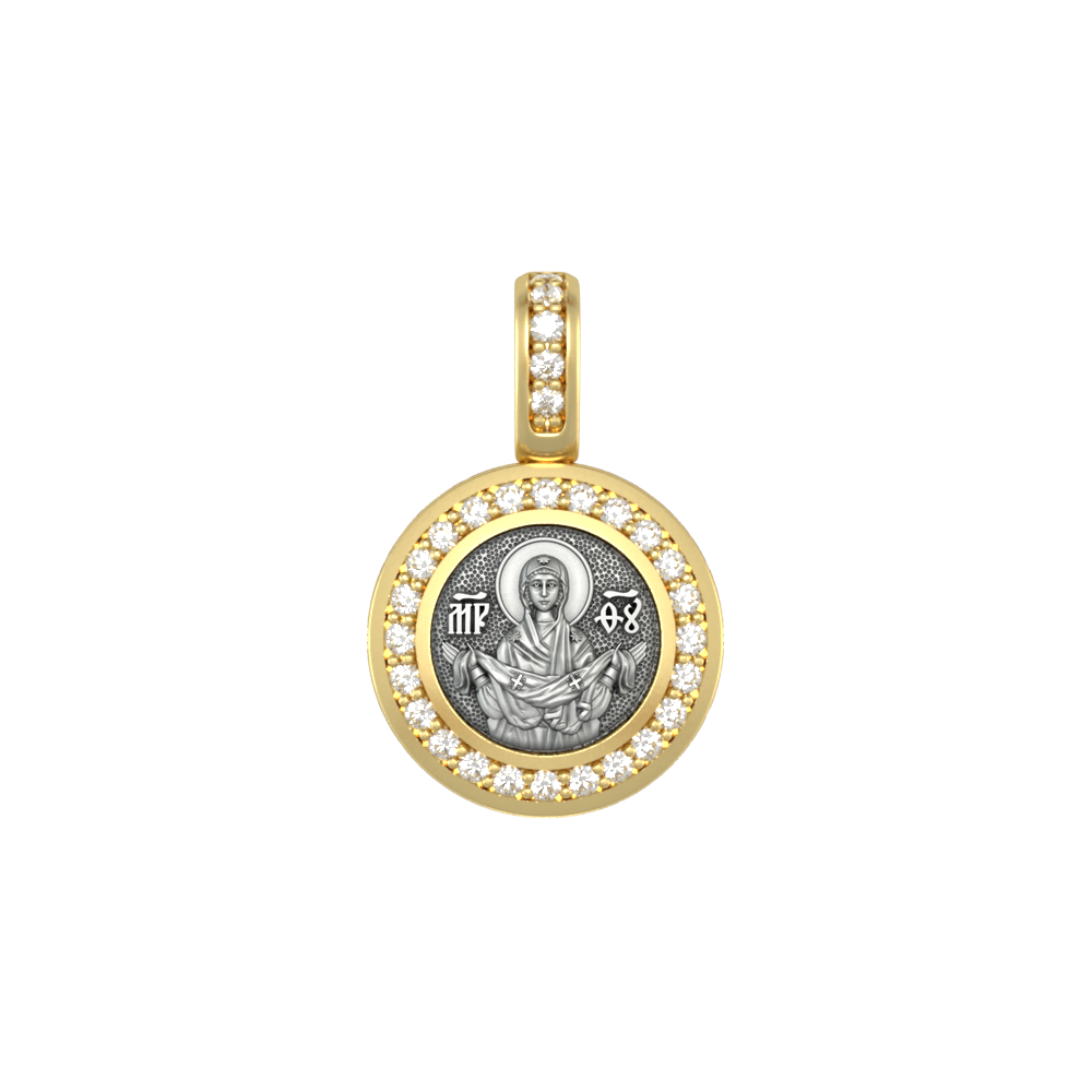 Нательная иконка с изображением Покров Пресвятой Богородицы на лицевой стороне и Ангелом Хранителем на оборотной. Лицевая сторона украшена 29 фианитами которые придают подвеске яркое сияние.