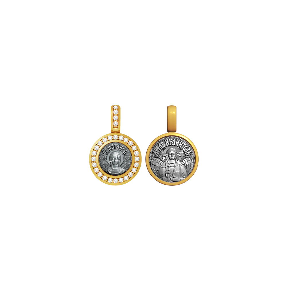 Серебряная нательная иконка с образом Святой Наталии на лицевой стороне и Ангелом Хранителем на оборотной. Лицевая сторона украшена 29 фианитами которые придают подвеске яркое сияние.
