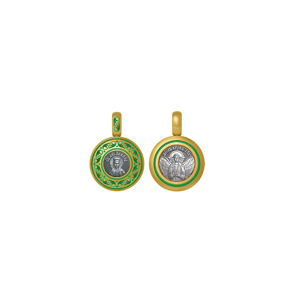 Нательная иконка с образом Святой Александры на лицевой стороне и Ангелом Хранителем на оборотной. Образок фрагментарно декорирован цветной горячей ювелирной эмалью, чернением и позолотой.
