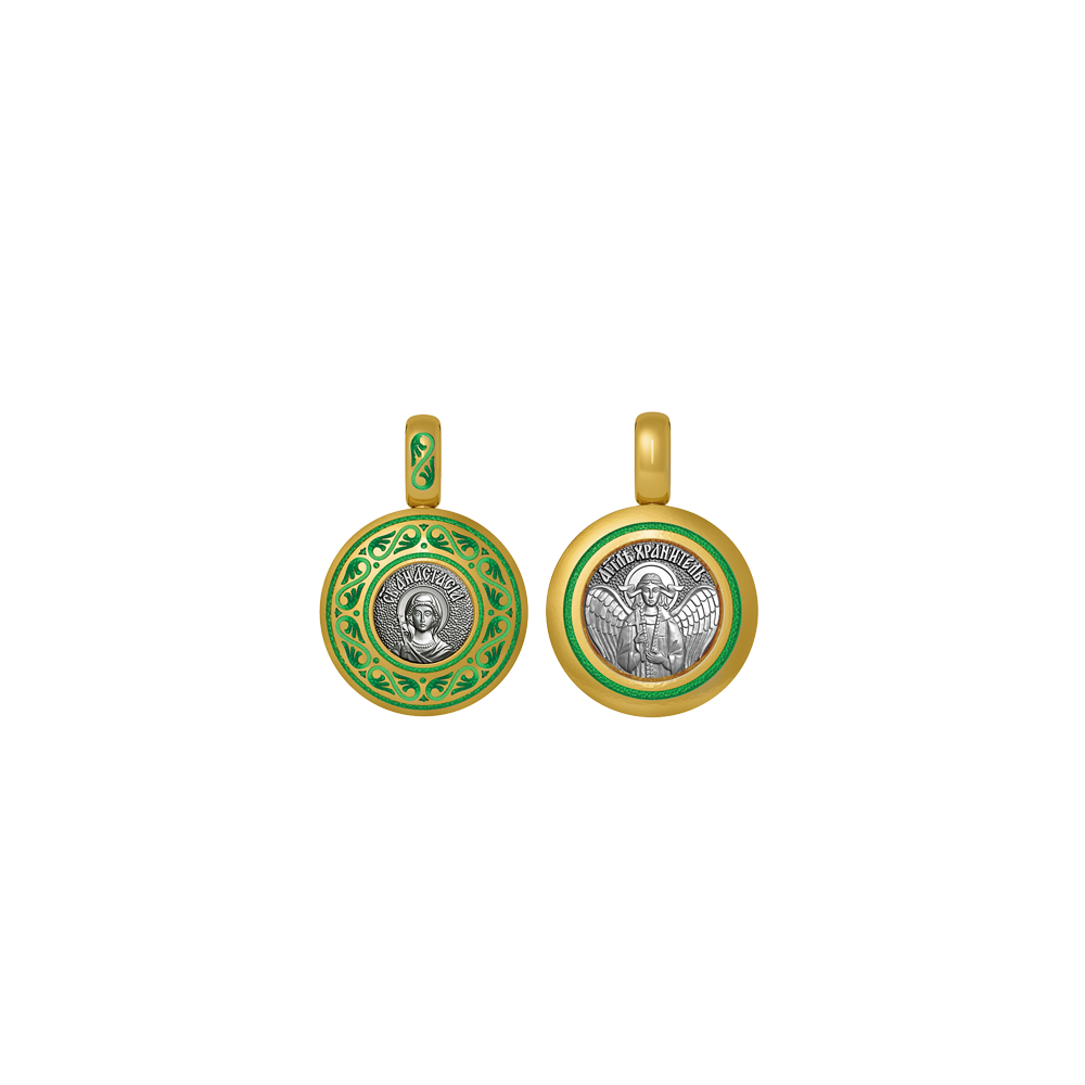 Нательная иконка с образом Святой Анастасии на лицевой стороне и Ангелом Хранителем на оборотной. Образок фрагментарно декорирован цветной горячей ювелирной эмалью, чернением и позолотой.