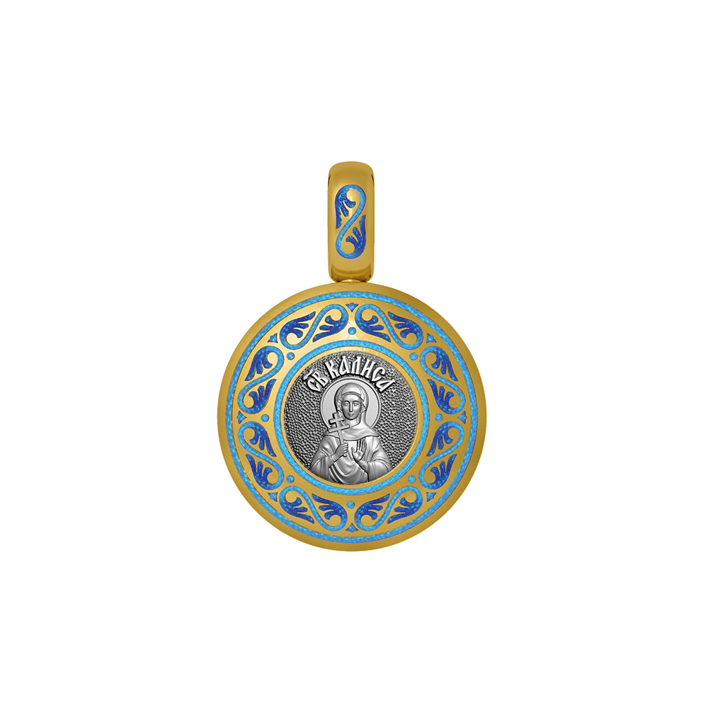 Нательная икона с ликом Святой Алисы (Калисы) на лицевой стороне и Ангелом Хранителем на оборотной. Образок фрагментарно декорирован цветной горячей ювелирной эмалью, чернением и позолотой.