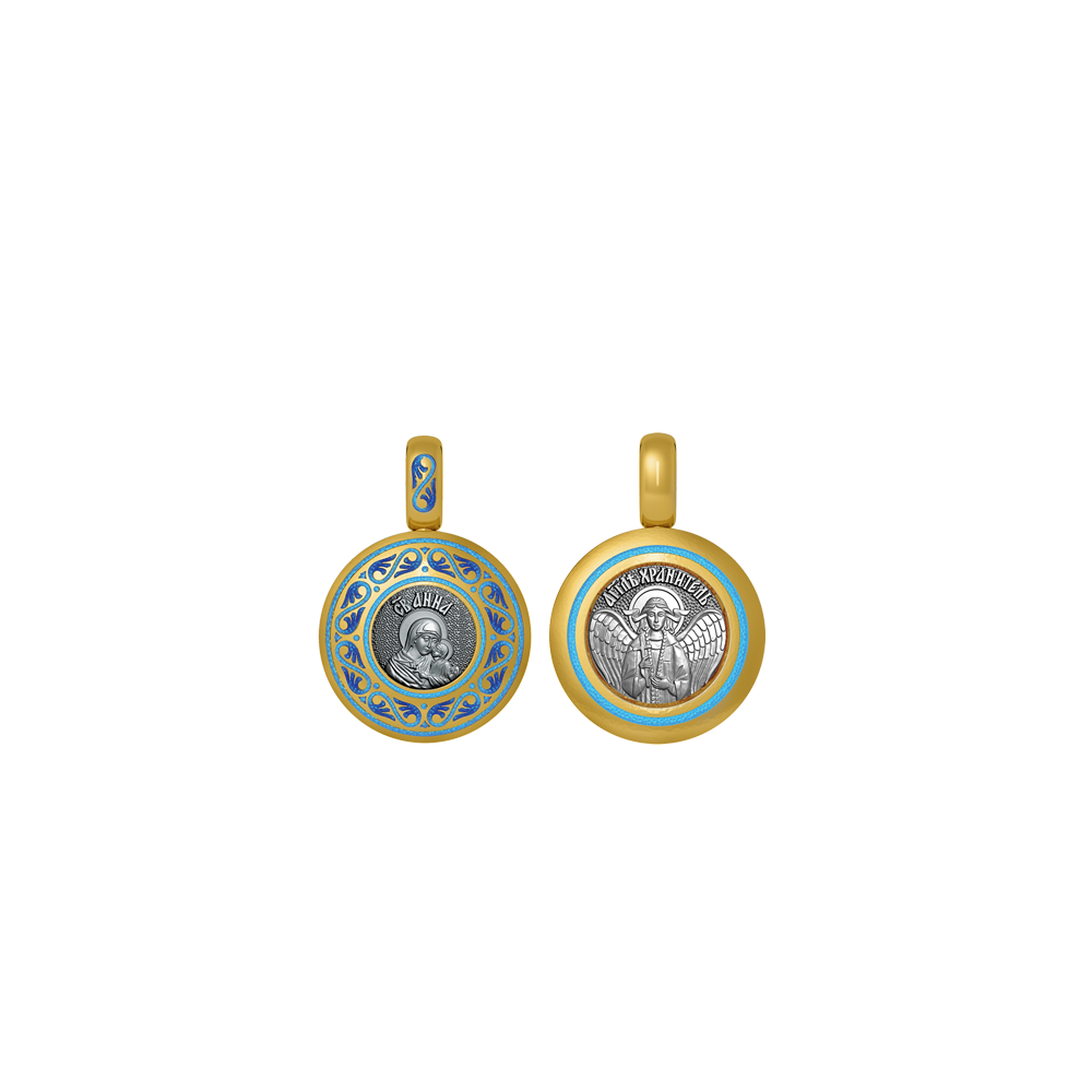 Нательная икона с ликом Святой праведной Анны на лицевой стороне и Ангелом Хранителем на оборотной. Образок фрагментарно декорирован цветной горячей ювелирной эмалью, чернением и позолотой.
