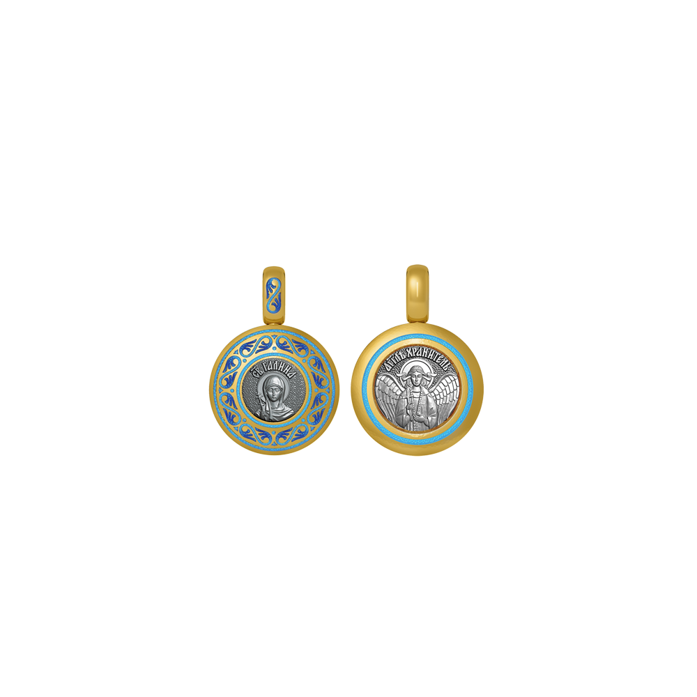 Подвеска с образом Святой мученицы Галины на лицевой стороне и Ангелом Хранителем на оборотной. Образок фрагментарно декорирован цветной горячей ювелирной эмалью, чернением и позолотой.