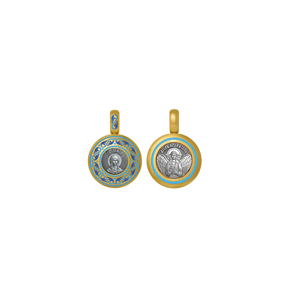 Православная иконка с образом Святой Ксении на лицевой стороне и Ангелом Хранителем на оборотной. Образок фрагментарно декорирован цветной горячей ювелирной эмалью, чернением и позолотой.