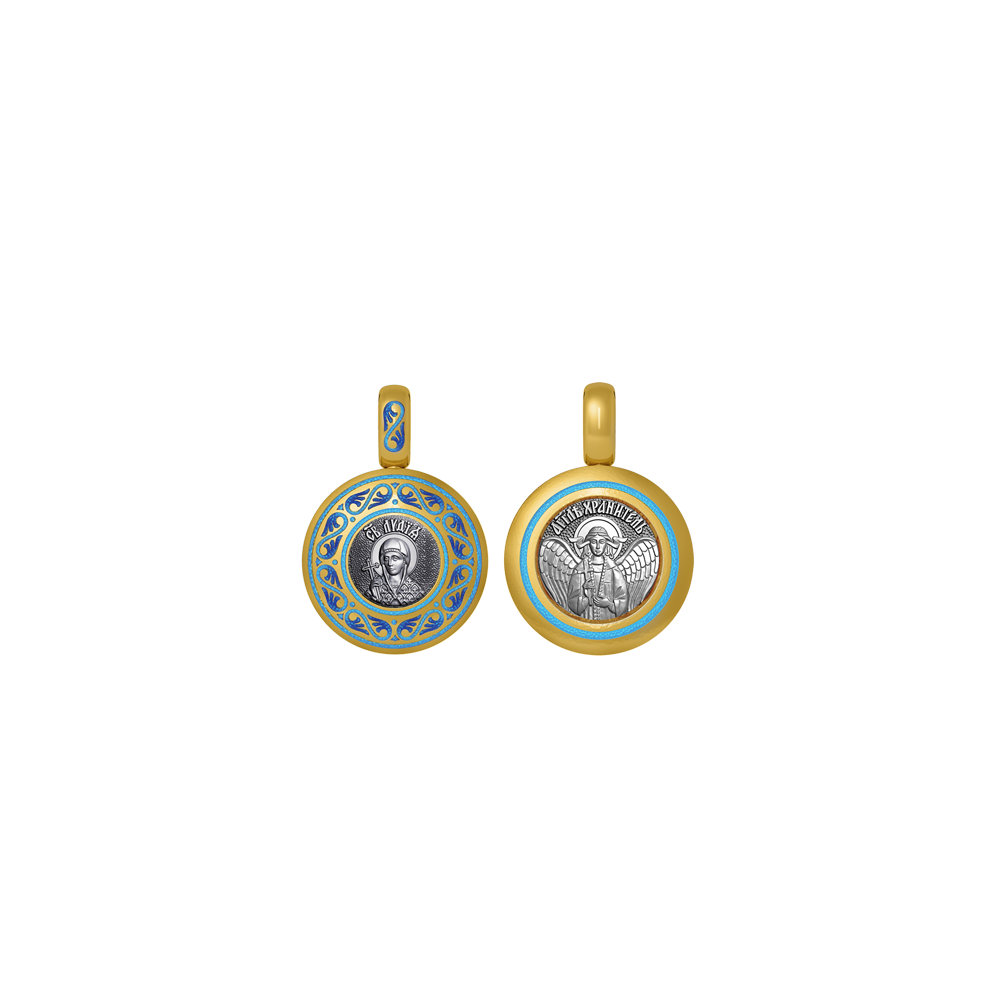 Православная иконка с образом Святой Лидии на лицевой стороне и Ангелом Хранителем на оборотной. Образок фрагментарно декорирован цветной горячей ювелирной эмалью, чернением и позолотой.