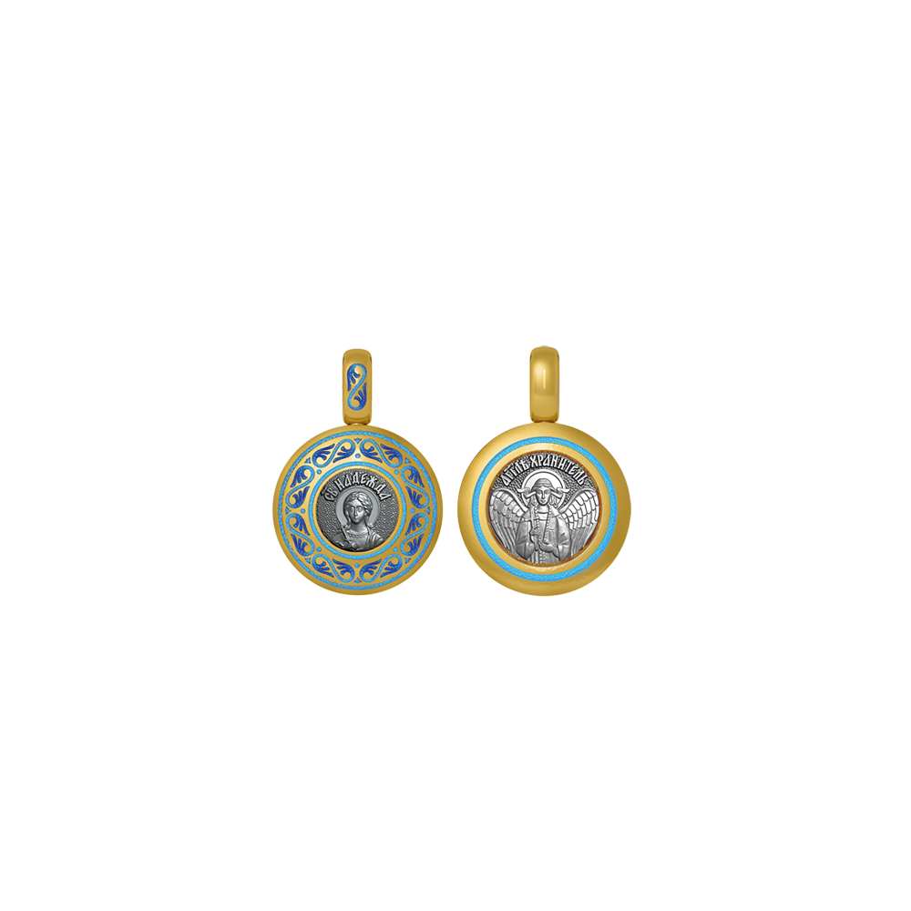 Нательная иконка с образом Святой Надежды на лицевой стороне и Ангелом Хранителем на оборотной. Образок фрагментарно декорирован цветной горячей ювелирной эмалью, чернением и позолотой.