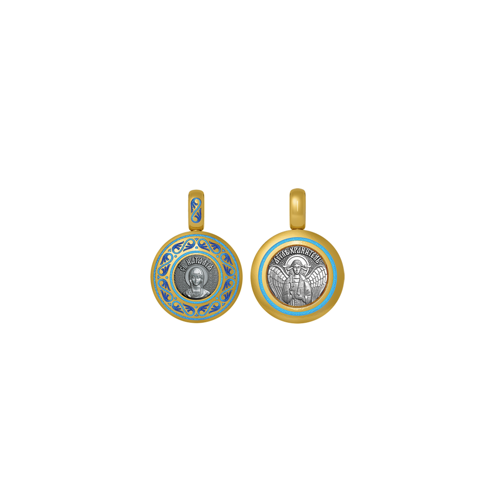 Православная иконка с образом Святой Наталии на лицевой стороне и Ангелом Хранителем на оборотной. Образок фрагментарно декорирован цветной горячей ювелирной эмалью, чернением и позолотой.