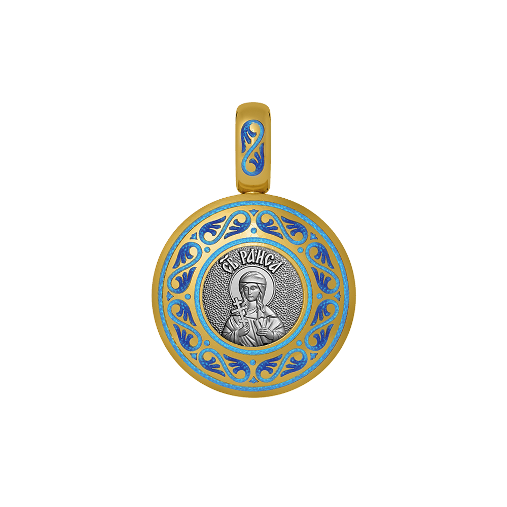 Нательная икона с образом Святой Раисы на лицевой стороне и Ангелом Хранителем на оборотной. Образок фрагментарно декорирован цветной горячей ювелирной эмалью, чернением и позолотой.