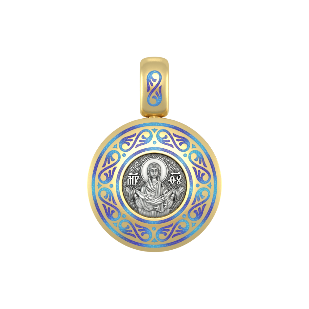 Нательная иконка с образом Покров Богородицы на лицевой стороне и Ангелом Хранителем на оборотной. Образок фрагментарно декорирован цветной горячей ювелирной эмалью, чернением и позолотой.