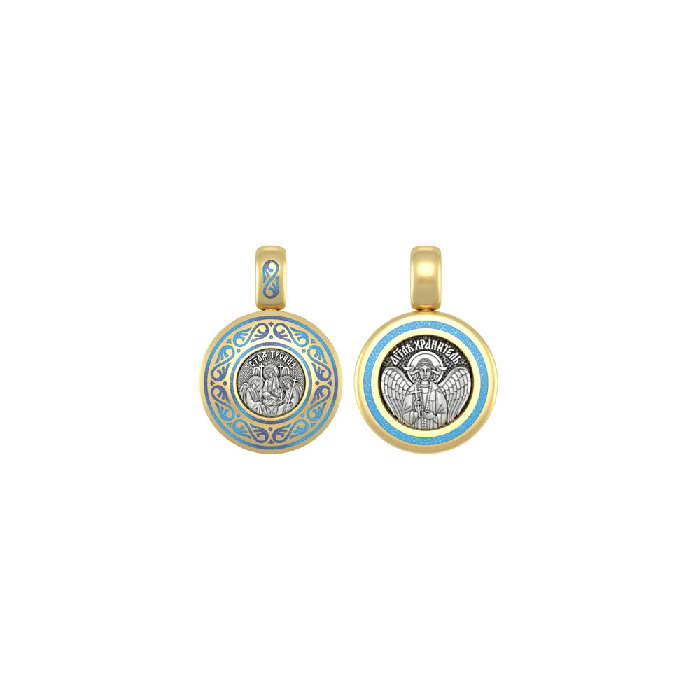 Православная иконка с образом Святой Троицы на лицевой стороне и Ангелом Хранителем на оборотной. Образок фрагментарно декорирован цветной горячей ювелирной эмалью, чернением и позолотой.