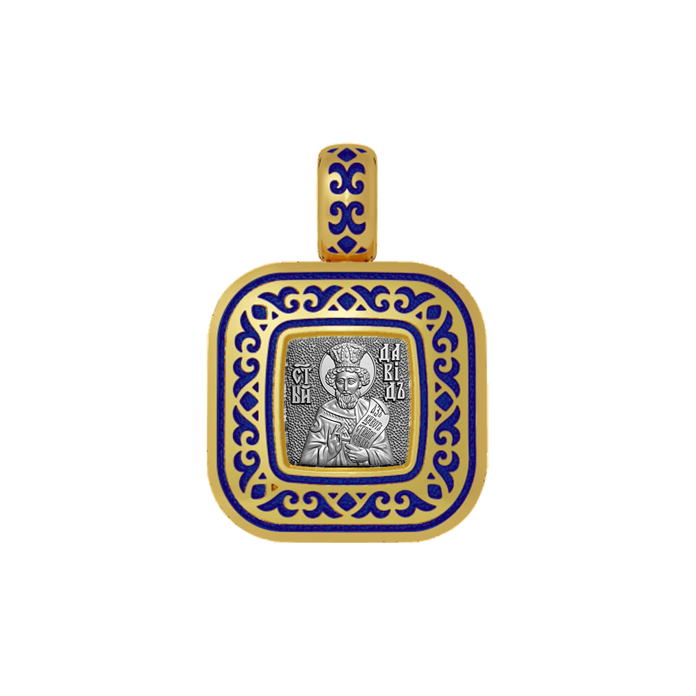 Нательная икона с образом Святого царя и пророка Давида на лицевой стороне и Ангелом на оборотной. Подвеска фрагментарно декорирована цветной горячей ювелирной эмалью, чернением и позолотой.