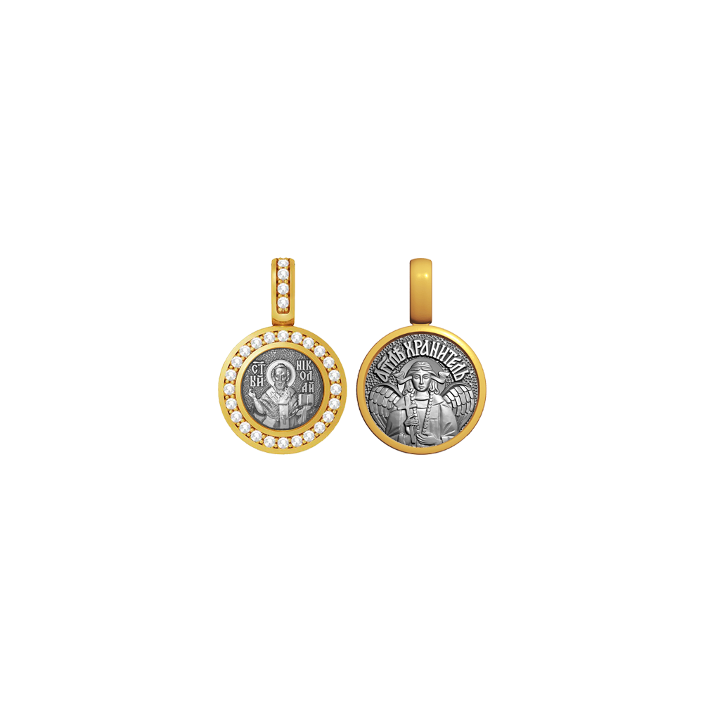Серебряная нательная икона с образом Святителя Николая на лицевой стороне и Ангелом Хранителем на оборотной. Лицевая сторона украшена 29 фианитами которые придают подвеске яркое сияние.