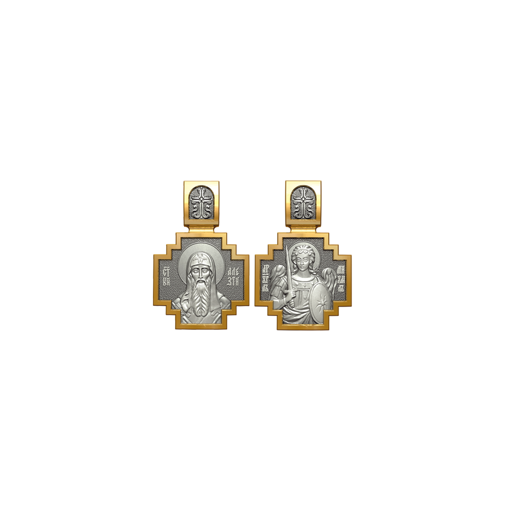 Позолоченная нательная иконка с почитаемым образом Святителя Алексея и Архангела Михаила, самого могучего ангела воинства Христова.