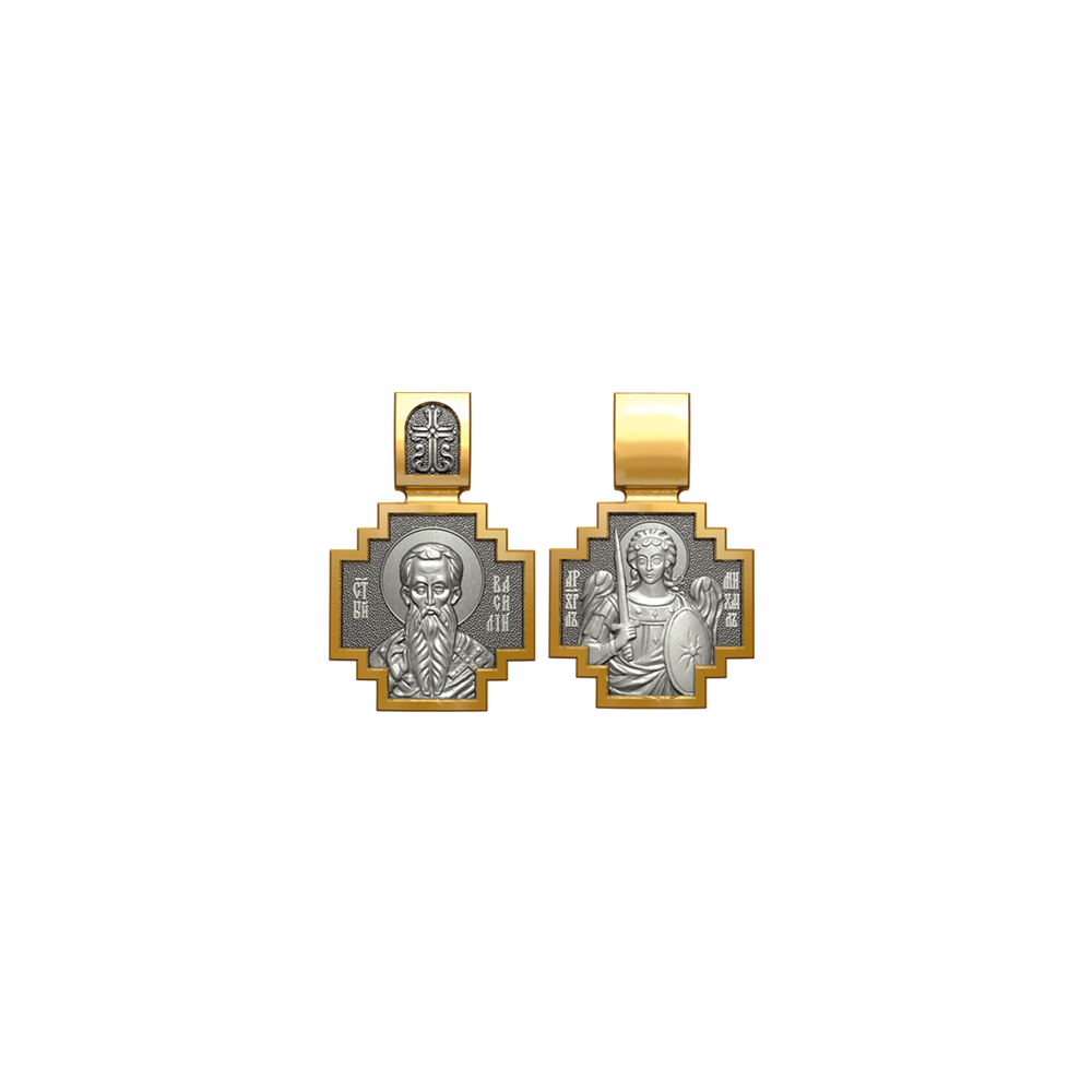 Позолоченная нательная иконка с почитаемым образом Святого Василия и Архангела Михаила, самого могучего ангела воинства Христова.
