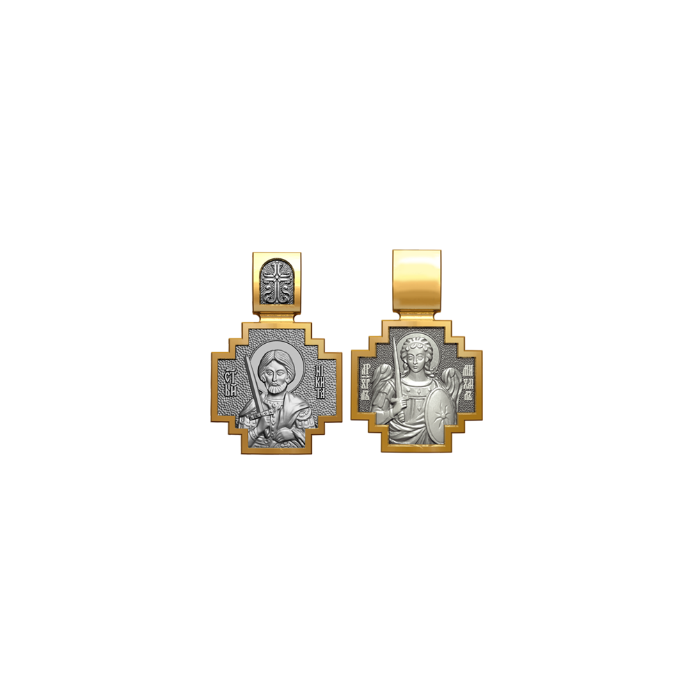Позолоченная нательная иконка с почитаемым образом Святого Никиты и Архангела Михаила, самого могучего ангела воинства Христова.