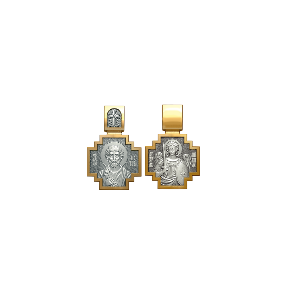 Позолоченная нательная иконка с почитаемым образом Апостола Петра и Архангела Михаила, самого могучего ангела воинства Христова.