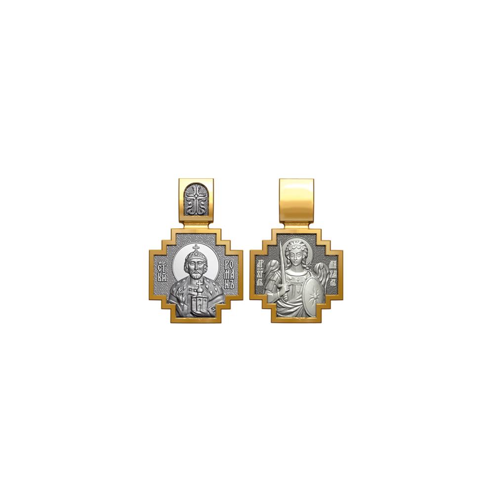 Позолоченная нательная иконка с почитаемым образом Святого Романа и Архангела Михаила, самого могучего ангела воинства Христова.