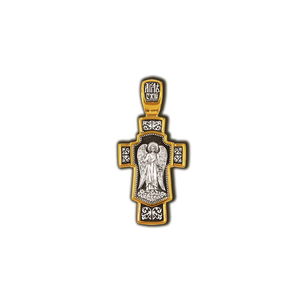 На лицевой стороне образка, выполненного в виде щита, закрывающего крест, изображен Ангел Хранитель. Это Ангел, который дается каждому человеку в Крещении для попечения и защиты его души. Ангел Хранитель неотступно находится рядом с человеком, помогая, оберегая и наставляя его, а после смерти сопровождает его душу через мытарства.