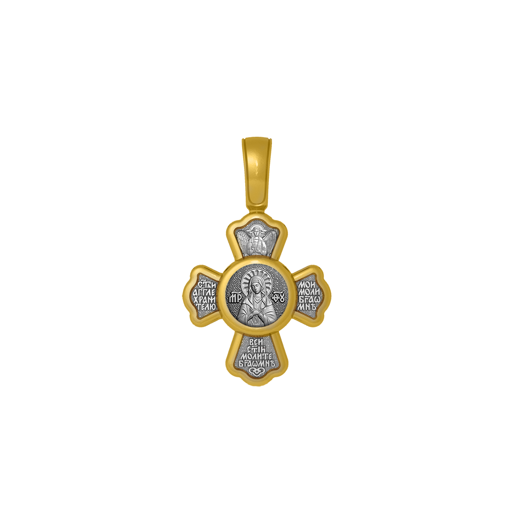 Крест с распятием Христовым на лицевой стороне и образом Божий Матери «Умиление» на оборотной. На крестике написана молитва: «Святый Ангел Хранитель мой моли Бога о мне», «Все святые молите Бога о мне».