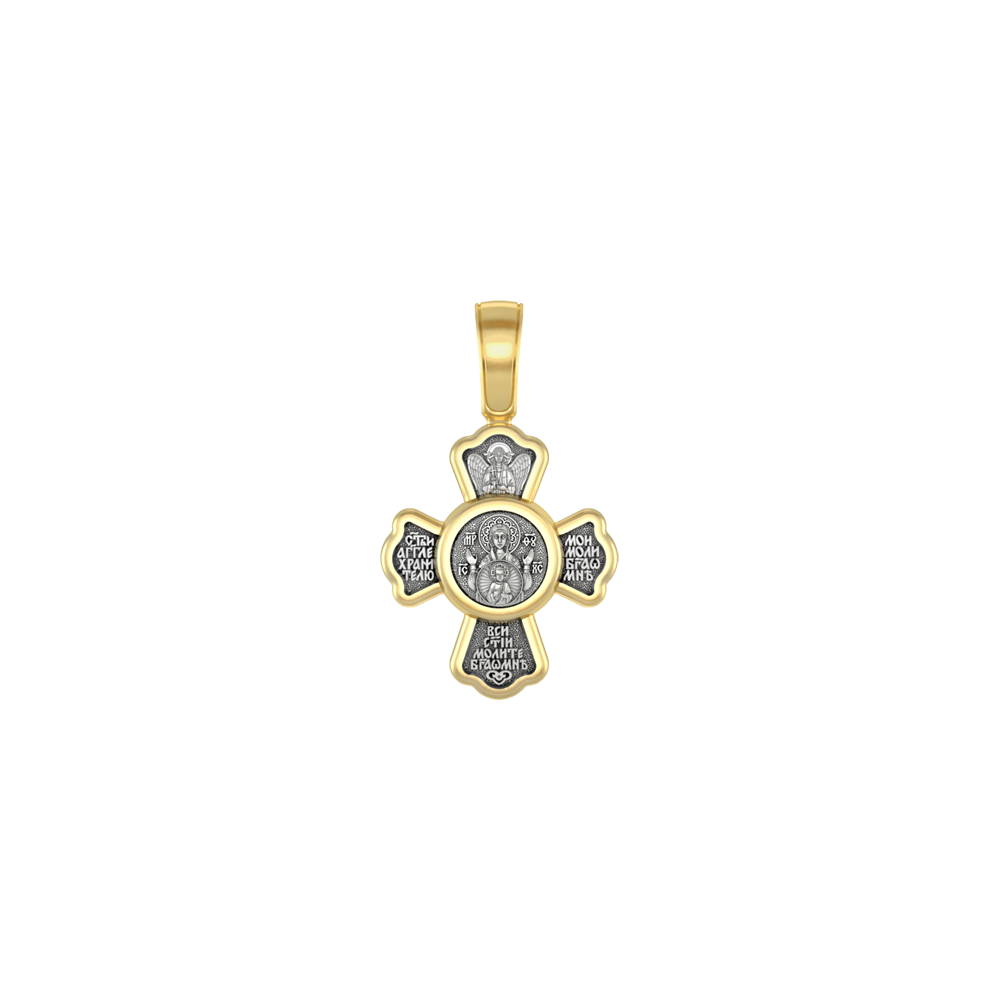 Крест с распятием Христовым на лицевой стороне и образом Божией Матери «Знамение» на оборотной. На крестике написана молитва: «Святый Ангел Хранитель мой моли Бога о мне», «Все святые молите Бога о мне».