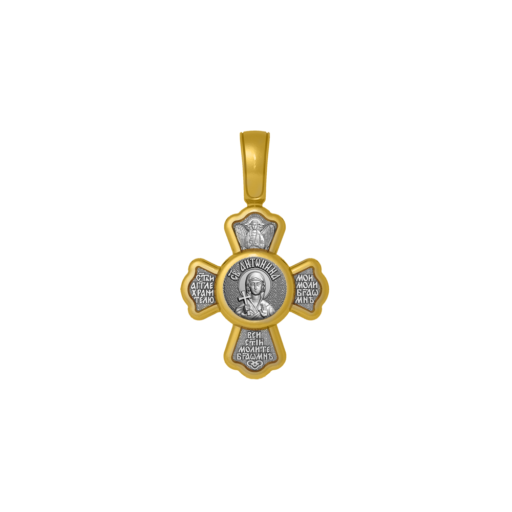 Крестик с распятием Христовым на лицевой стороне и образом Святой мученицы Антонины на оборотной. На кресте написана молитва: «Святый Ангел Хранитель мой моли Бога о мне», «Все святые молите Бога о мне».