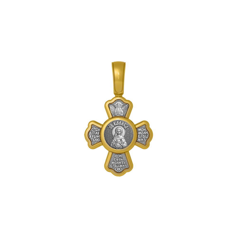 Крест с распятием Христовым на лицевой стороне и образом Святой мученицы Алисы на оборотной. На крестике написана молитва: «Святый Ангел Хранитель мой моли Бога о мне», «Все святые молите Бога о мне».
