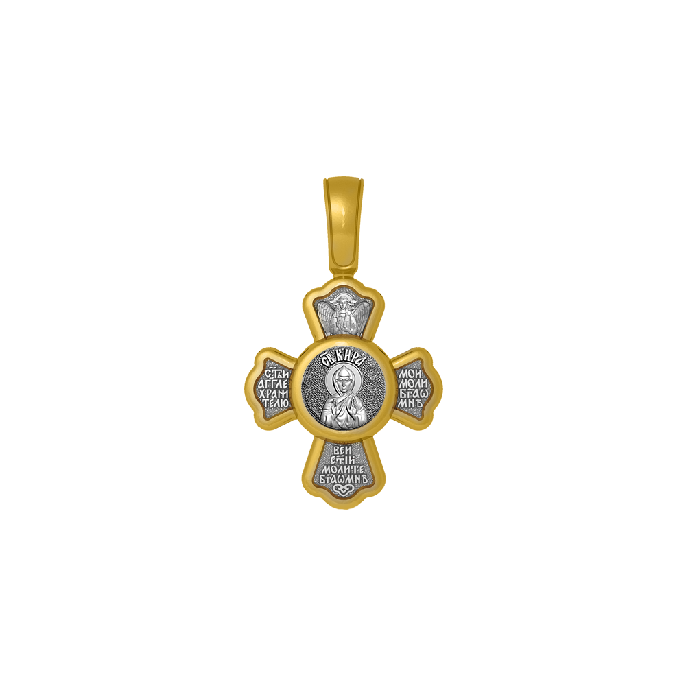 Крест с распятием Христовым на лицевой стороне и образом Святой преподобной Киры на оборотной. На крестике написана молитва: «Святый Ангел Хранитель мой моли Бога о мне», «Все святые молите Бога о мне».